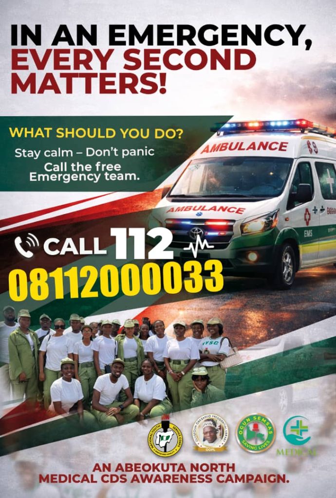 The Abeokuta North Medical Community Development Service (CDS) group of Ogun State National Youth Service Corps (NYSC) has organized a community outreach program in partnership with the Ogun State Emergency Medical Ambulance Services under the director, Dr Hassan Adelakun.